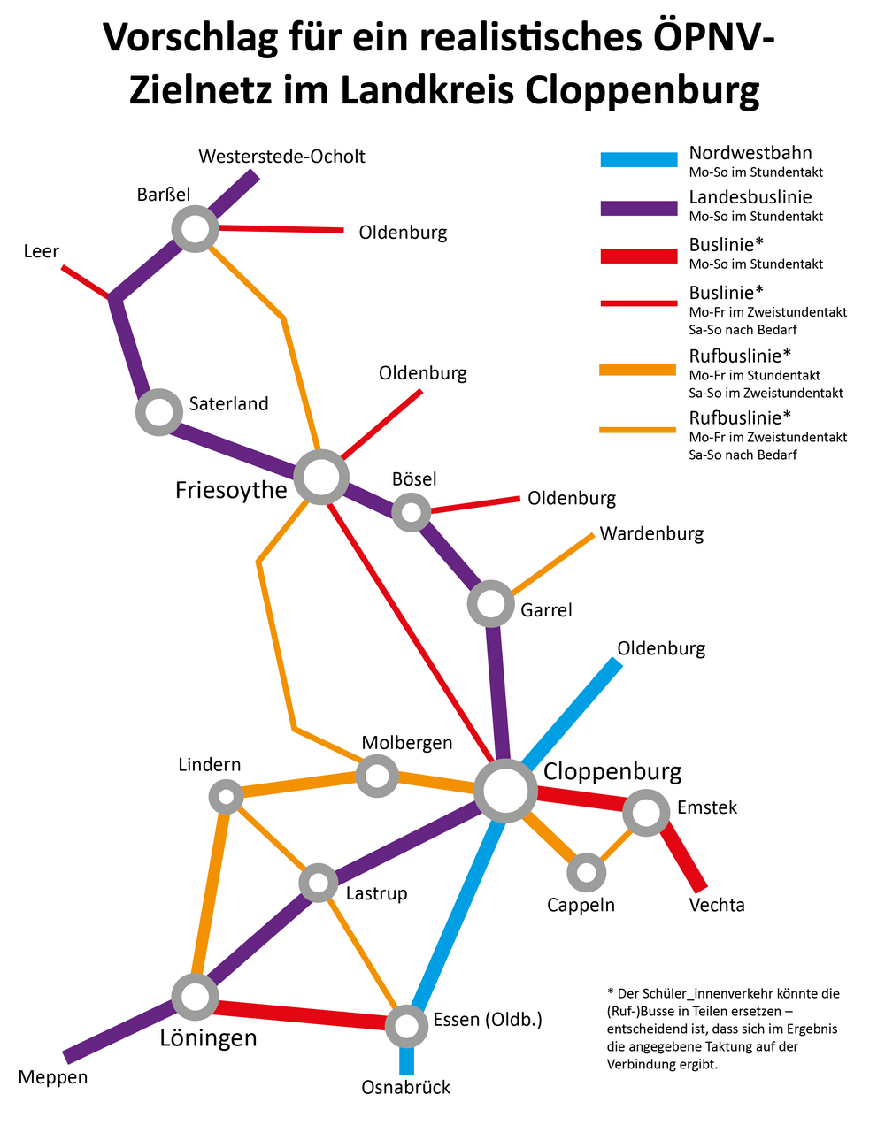 Es wird die Einrichtung zwei neuer Linien Westerstede-Ocholt – Barßel – Saterland – Friesoythe – Bösel – Garrel – Cloppenburg und Meppen – Haselünne – Herzlake – Löningen – Lastrup – Cloppenburg durch eine Aufnahme in das Programm zur Förderung von landesbedeutsamen Buslinien angestrebt. Diese Linien müssen mindestens im Stundentakt und an Werktagen von 6 bis 23 Uhr verkehren.