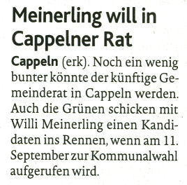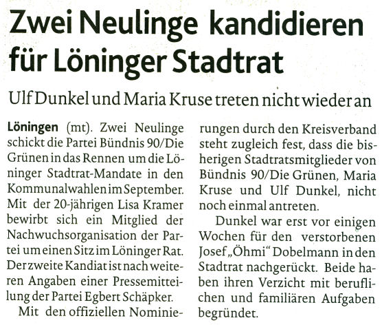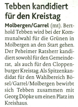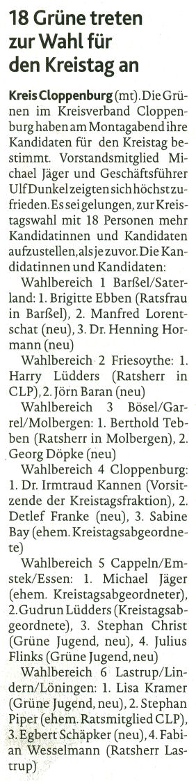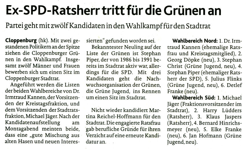 In der Kreisstadt Cloppenburg bewerben sich - wie schon vor fünf Jahren - insgesamt zwölf Kandidatinnen und Kandidaten. Angeführt werden die Listen von "gestandenen" Grünen Kommunalpolitikern: Dr. Irmtraud Kannen (Nord) und Michael Jäger (Süd). Beide würdigten, dass eine "gute Mischung aus alten Hasen und neuen Interessierten" gelungen sei. Mitglieder der Grünen Jugend gehörten ebenso dazu wie ein ehemaliges Stadtratsmitglied der SPD.