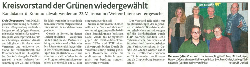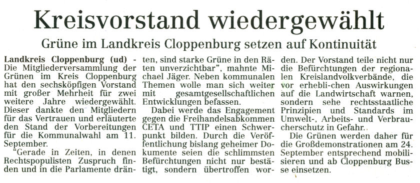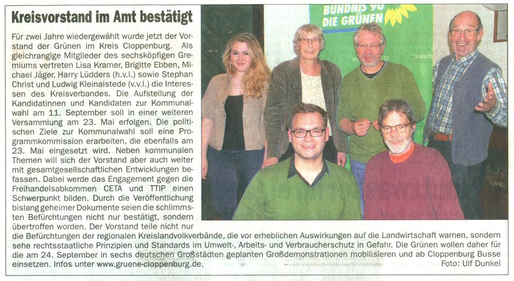 Neben kommunalen Themen will sich der Vorstand aber auch weiter mit gesamtgesellschaftlichen Entwicklungen befassen. Dabei werde das Engagement gegen die Freihandelsabkommen CETA und TTIP einen Schwerpunkt bilden. Durch die Veröffentlichung bislang geheimer Dokumente seien die schlimmsten Befürchtungen nicht nur bestätigt, sondern übertroffen worden. Der Vorstand teile nicht nur die Befürchtungen der regionalen Kreislandvolkverbände, die vor erheblichen Auswirkungen auf die Landwirtschaft warnen, sondern sehe rechtsstaatliche Prinzipien und Standards im Umwelt-, Arbeits- und Verbraucherschutz in Gefahr. Die Grünen würden daher für die Großdemonstrationen am 24. September mobilisieren und ab Cloppenburg Busse einsetzen.