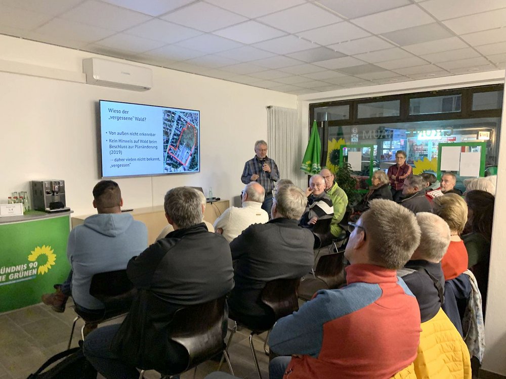 Auf einer gut besuchten Veranstaltung zum "Vergessenen Wald" berichtete und diskutierte die Ratsgruppe Grüne/UWG am 23.11. im "Grünen Raum" die Forderung nach dem Erhalt eines ca. 1 ha großen Waldes, der sich seit Jahrzehnte n - weitgehend unbemerkt - auf einer privaten Gewerbefläche angesiedelt hatte. Einig waren sich alle Teilnehmenden darin, dass sich in Zeiten des ungebremsten Klimawandels die Rodung eines Waldes zur Schaffung von Bauland verbietet.