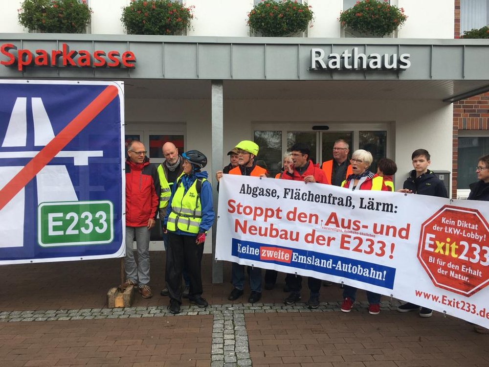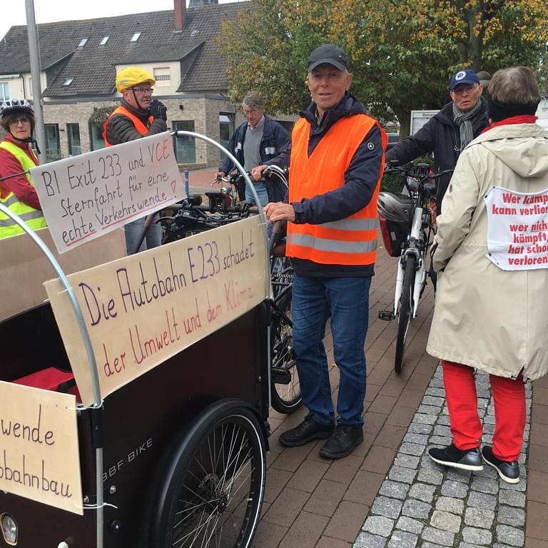 Fahrrad-Sternfahrt des Vereins Verkehrswende Cloppenburg/Emsland e.V. und der Bürgerinitiative Exit 233 gegen den vierspurigen Aus- und Neubau der E 233 zur Autobahn.