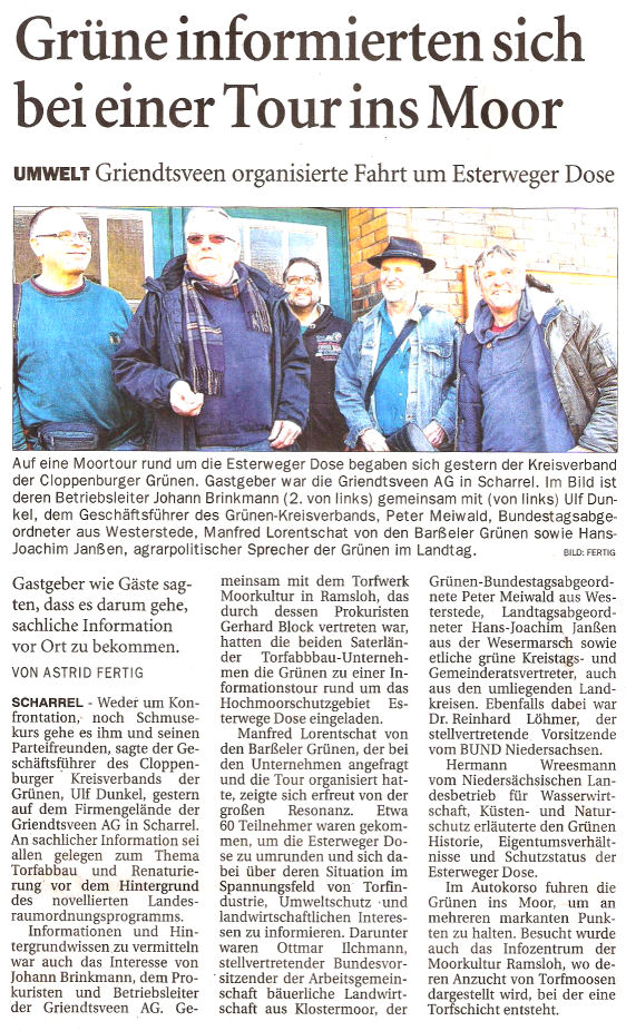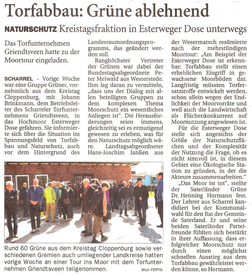 Unter Leitung des Betriebsleiters und Prokuristen des Torfwerkes, Herrn Hans Brinkmann, geht es in Fahrgemeinschaften im eigenen PKW ins Moor. Teilnehmen werden auch der Parlamentarier Peter Meiwald (MdB, Sprecher für Umweltpolitik) sowie der umweltpolitische Sprecher der Landtagsfraktion Hanso Janssen (Sprecher für Agrarpolitik, Naturschutz, Forstwirtschaft, Fischerei und Raumordnung). Es werden markante Stellen angefahren, an denen Erläuterungen zum Torfabbau, zur Wiedervernässung sowie zur Auswirkung des Moorabbaus auf Natur und Umwelt gegeben werden. Zudem wird die Arbeitsweise des Unternehmens vorgestellt. Dazu gehören die Vorstellung der Produktpalette sowie Aktivitäten im Hinblick auf „Torf und Klimaschutz“, Flächenerwerb und die politische Situation.