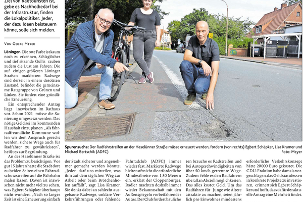 05.09.2020 - von Egbert Schäpker - Die Gruppe Bündnis 90/Die Grünen / Die Linke im Löninger Stadtrat hat einen Antrag mit ersten konkreten Verbesserungen der Radinfrastruktur beim Bürgermeister Marcus Willen eingereicht. In diesem Antrag fordert die Gruppe, dass die Fahrradschutzstreifen an der Haselünner, –…