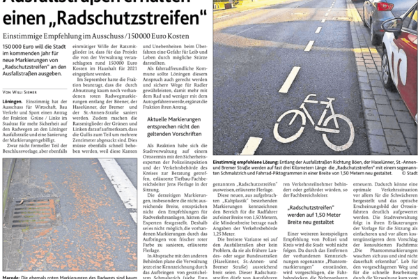 17.11.2020 - Einstimmig hat der Ausschuss für Wirtschaft, Bau, Verkehr und Sport den Antrag der Fraktion Grüne/Linke im Stadtrat für mehr Sicherheit auf den Radwegen an den Löninger Ausfallstraßen und eine Sanierung der Markierungen gebilligt. (Stand 12.11.20)