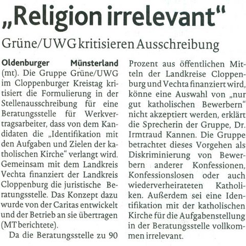 06.12.2017 - von Dr. Irmtraud Kannen - Pressemitteilung Thema: Beratungsstelle für Werkvertragsarbeiter Gemeinsam mit dem Landkreis Vechta finanziert der Landkreis Cloppenburg die Einrichtung einer Beratungsstelle für Werkvertragsarbeiter/innen. Das Konzept dazu wurde von der Caritas entwickelt, der auch die Trägerschaft für die…