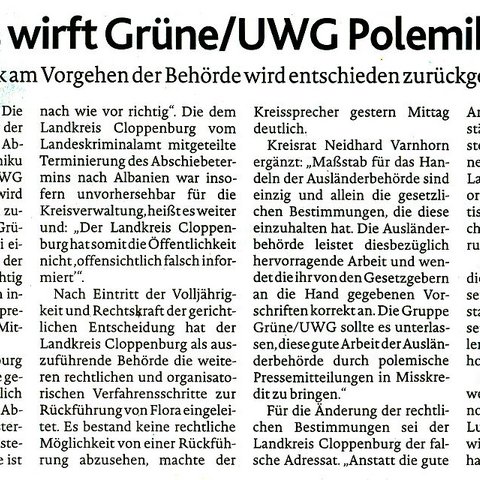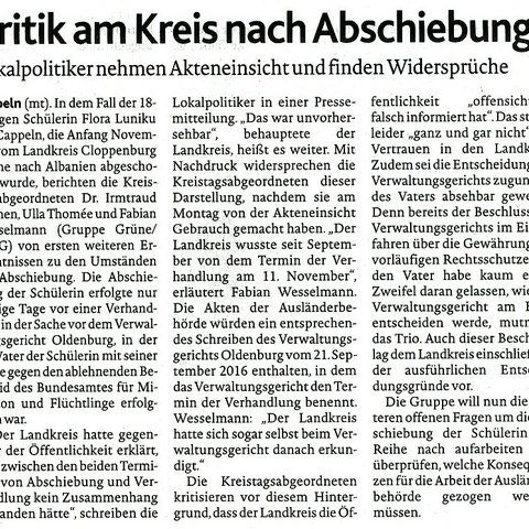 13.01.2017 - von Fabian Wesselmann - Verärgert reagieren die Kreistagsabgeordneten Dr. Irmtraud Kannen, Ulla Thomée und Fabian Wesselmann (Gruppe Grüne/UWG) auf die Weigerung der Kreisverwaltung, eine Anfrage des Garreler Ratsherrn Tobias Bohmann zur Schülerbeförderung zu beantworten. Laut Medienberichten habe die Kreisverwaltung…