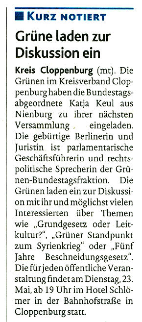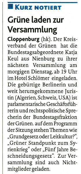 Die GRÜNEN im Kreisverband Cloppenburg haben die Bundestagsabgeordnete Katja Keul aus Nienburg zu ihrer nächsten Versammlung eingeladen. Die gebürtige Berlinerin und weit herumgekommene Juristin (Algerien, Schweiz, USA) ist parlamentarische Geschäftsführerin und rechtspolitische Sprecherin der GRÜNEN-Bundestagsfraktion. Die Grünen laden ein zur Diskussion mit ihr und möglichst vielen Interessierten über Themen wie "Grundgesetz oder Leitkultur?", "Grüner Standpunkt zum Syrienkrieg" oder "Fünf Jahre Beschneidungsgesetz".
